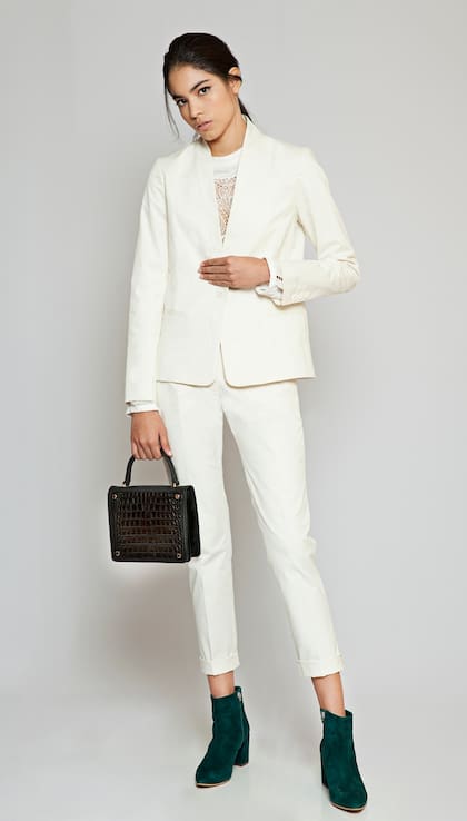 Botinetas: Mini cartera rígida (Via Uno, $ 2999), booties de gamuza (Sofi Martiré, $ 3990), blusa con bordado (Basement, $ 1490), blazer y pantalón recto (Paula Cahen d’ Anvers, $ 2970 y $ 2100)