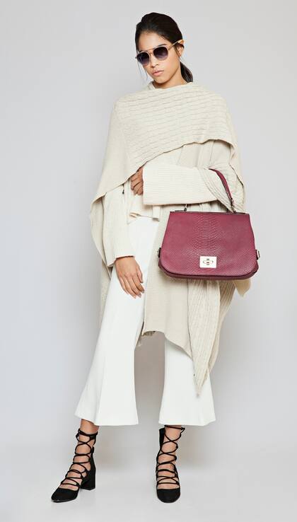 Taco cuadrado: Zapatos de gamuza con tiras (The Bag Belt, $ 2945), cartera de cuero con solapa (Blaquè, $ 2890), ruana de punto (Uma, $ 2600), suéter de manga campana (Mishka, $ 2220) y pantalón de crepé (Jazmín Chebar, $ 2950)