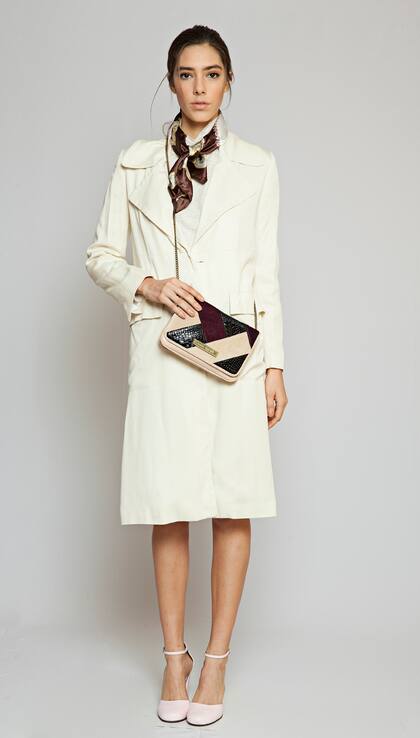 Mary Janes: Mini bandolera con recortes (Carla Danelli, $ 2200), zapatos tipo guillerminas (Paruolo, $ 2949), , trench (Trosman, $ 5190), polera de algodón (Paula Cahen d’ Anvers, $ 990) y pañuelo (Las Penélope, $ 178)
