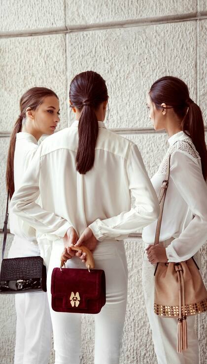 Carteras: Bandolera de charol y cuero grabado (Mishka, $ 3720), camisa básica (Ayres, $ 1598) y pantalón de jean (Tucci, $ 1190). Mini cartera de gamuza con manija de madera (Sarkany, $ 5850), camisa con lazo (Zhoue, $ 937) y pantalón básico (Paula Cahen d’ Anvers, $ 2100). Cartera marinera con tachas (Hush Puppies, $ 1200), blusa con guipure (Americanino en Falabella, $ 1490) y pantalón boyfriend (Paula Cahen d’ Anvers, $ 1570)