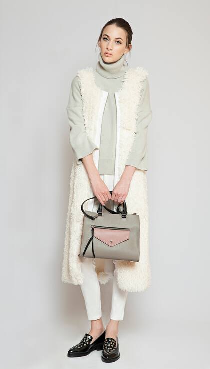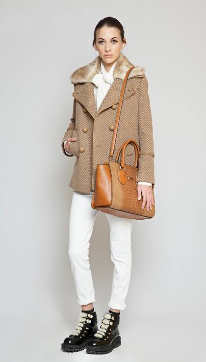Borcegos: Cartera combinada (XL, $ 1190), borcegos con piel (Prüne, $ 3590), tapado con piel (Vitamina, $ 8300), camisa con moño (Las Pepas, $ 1690) y pantalón de jean (Ayres, $ 1478)