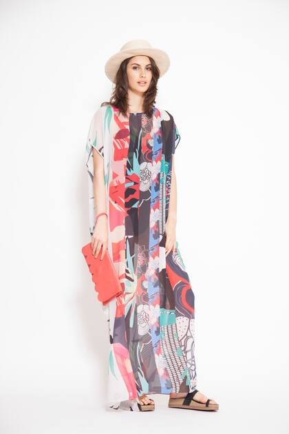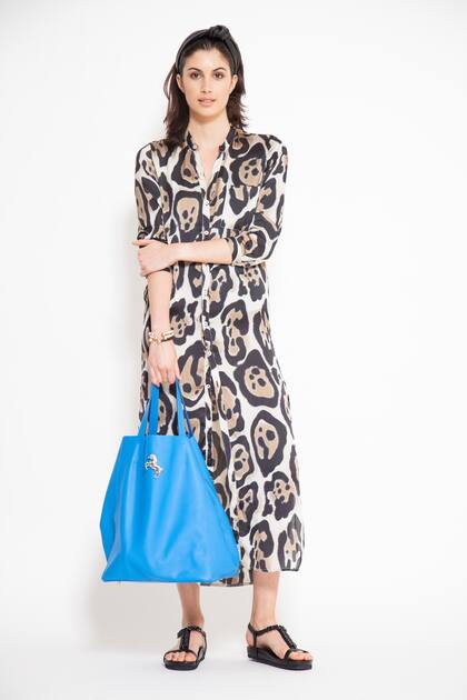 MIX AND MATCH: Larga con estampas combinadas (Mariana Dappiano, $ 5300), sobre de cuero (Lovitta, $ 1100), sandalias con piedras (a pie, $ 1750) y sombrero de rafia (Compañía de Sombreros, $ 720)