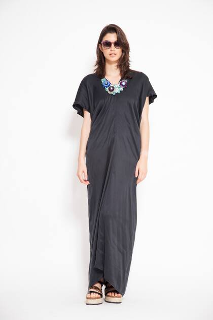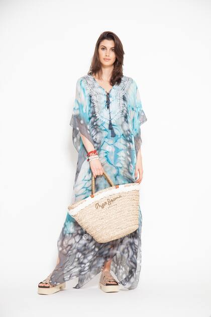 CAFTÁN: Al tobillo con volados en el escote V (Rapsodia, $ 1800), sandalias animal print con piedras (Uma, $ 2890) y capelina de rafia (Compañía de Sombreros, $ 640)