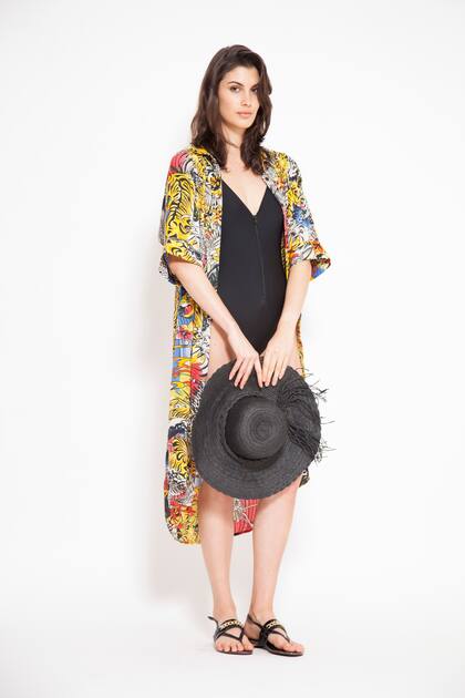 CAMISOLA: Larga y estampada (Cher, $ 3200), traje de baño con cierre (Caro Cuore), sandalias chatas con cadena (a pie, $ 990) y capelina (Basement, $ 179)