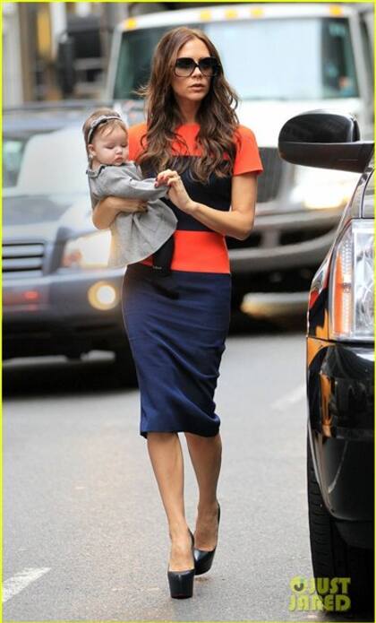 Ella es una fashionista: siempre atenta a la última moda, vestida de pies a cabeza por firmas de diseño. Por eso no llama la atención que Victoria Beckham no haya modificado su rutina de vestimenta durante ninguno de sus cuatro embarazos. A mediados de 2011, la ex cantante, devenida diseñadora de indumentaria, tuvo a su hija Harper, y ni antes ni después se bajó de los tacos. Tampoco dejó de usar los pantalones de cuero, las faldas lápiz y los impecables vestidos envolventes que la caracterizan. Eso sí: el negro fue el tono obligatorio. Ahora, a imagen y semejanza, Victoria viste a Harper –que dio sus primeros pasos sobre la pasarela de su último desfile en el MBFW– con minivestidos y ballerinas de Marc Jacobs, Chloé y Stella McCartney.