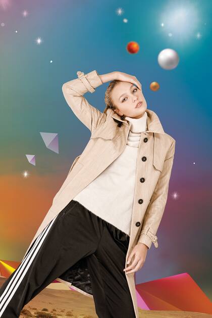 Trench simil cuero texturizado, Vitamina; polera, Uma; pantalón deportivo, Adidas