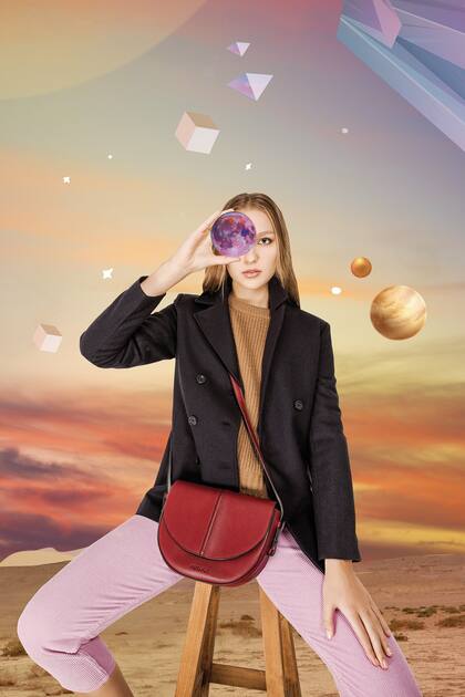 Saco de paño cruzado, Giesso; suéter cuello redondo, Mishka; pantalón de corderoy, Etiqueta Negra; cartera bandolera, Mishka