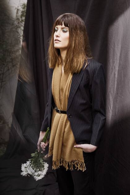 Saco se lana tizado, pantalón de vestir, chal de lana como top y cinturón de cuero, Giesso