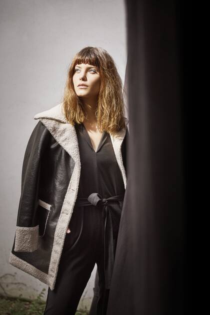 Mono con escote en V, Prüne, y gabán de ecocuero, Mirta Armesto