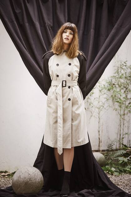 Trench cruzado con mangas de duvet, Perramus, y zapatos de charol en punta, Prüne