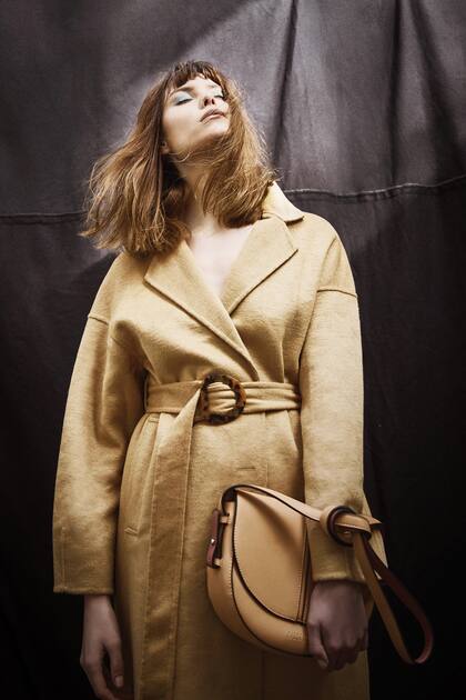 Tapado de paño con cinturón símil carey, Las Pepas, cartera de cuero, Mishka