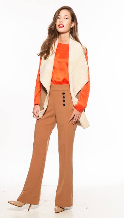 CUERO: Blusa de seda manga larga (Trosman, $ 2890), pantalón talle alto con botones (Vitamina, $ 1850), chaleco de cuero y corderito (Jazmín Chebar, $ 11.000) y stilettos de charol (Valdez, $ 4050)