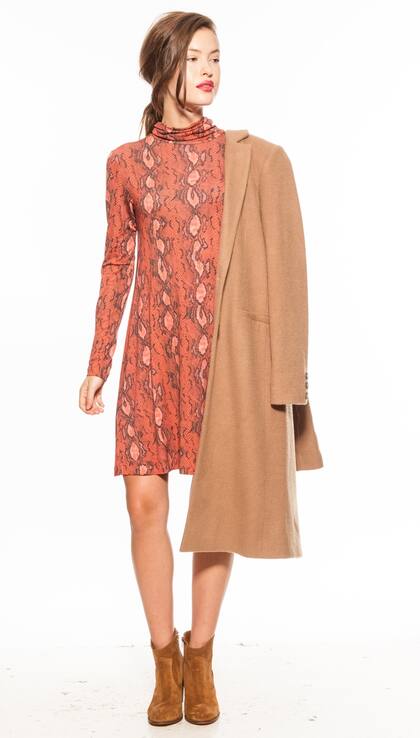 ESTAMPA PITÓN: Vestido polera manga larga con estampa piton (Clara, $ 1600),tapado oversize (Portsaid, $ 3690) y botas de gamuza (a pie, $ 2300)