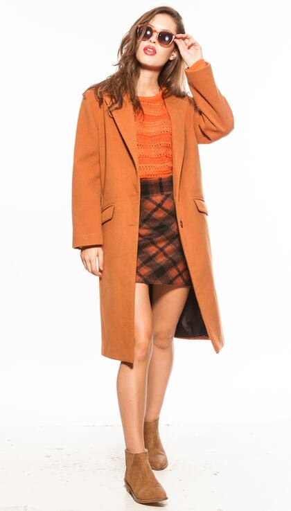 $ 1500), tapado 7/8 de paño y falda a cuadros (Complot,$ 3700 y $ 1600), botas cortas de gamuza (Sofía Sarkany, $ 4600), anteojos marco naranja (Vulk, $ 1970)