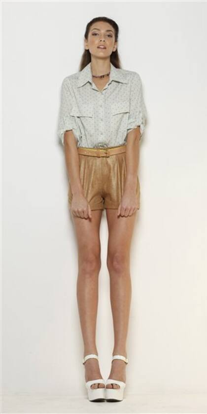 Musculosa de seda bordada con lentejuelas (Ayres, $ 678), short de crêpe de seda (Vero Alfie, $ 460) y zapatos de cuero metalizado (Josefina Ferroni, $ 1400)