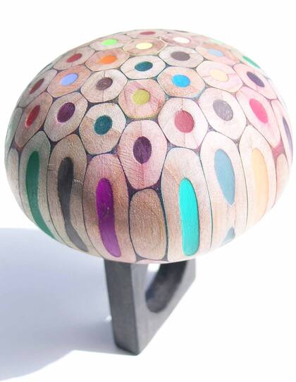 Trabaja a partir de la disección de lápices de colores, que pega y obtiene una superficie que convierte en anillos planos y otros más voluminosos, pulseras y colgantes con hendiduras y recortes.
