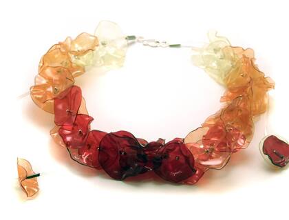 Otra de las joyeras que se destaca por su trabajo con PET. De otra manera, con su estilo, recorta botellas descartadas y crea lentejuelas que combina con cordones de cuero, nylon y arandelas de goma cuyo tamaño se regula. Asimismo elabora otras piezas con palillos de caña de bambú, también nylon, perlas, herrajes de plata e imanes.