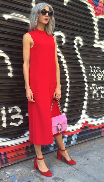 Rosa y rojo: la combinación de Lady Di se usa y mucho. Con cartera Gucci y pelo gris, otras grandes tendencias del verano en NYFW.