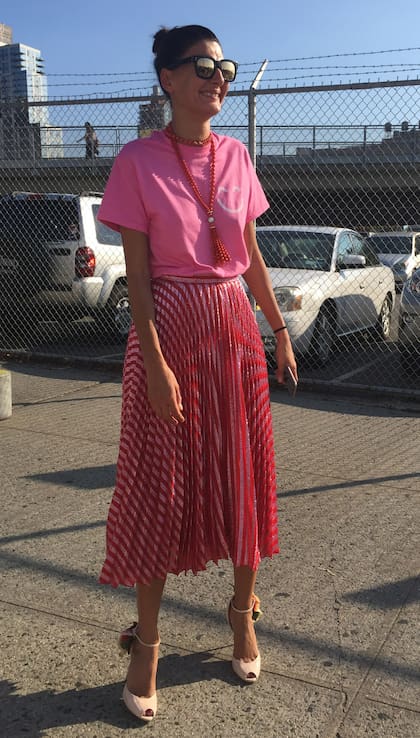 Giovana Battaglia Engelbert, estilista de la Vogue japonesa, de rosa y rojo con pollera Gucci.