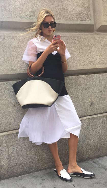 Mangas XL en camisería masculina, pollera estampada en blanco y negro y accesorios contundentes.