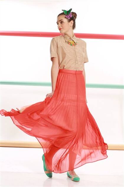 Camisa tipo safari con charreteras (Ayres, $ 448), maxifalda plisada (Uma, $ 1180), collar de cadenas y púas de colores (La Mercería, $ 180), sobre de cuero combinado (La Mercería, $ 460) y mocasines de gamuza (Uma, $ 1100)