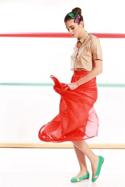 Fernando Vanegas Suéter de hilo con mangas de gasa y bordado (A.Y. not dead, $ 768), falda línea A (El Camarín, $ 1800), gafas de sol (Orbital, $ 700), cinto camel de cuero con bordes en neón (Paula Cahen d'Anvers, $ 260), anillo con piedra coral (Las Juanas, $ 220), cartera de cuero visón con mango combinado (Prüne, $ 1150) y stilettos (Paruolo, $ 1199)