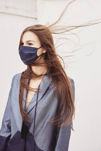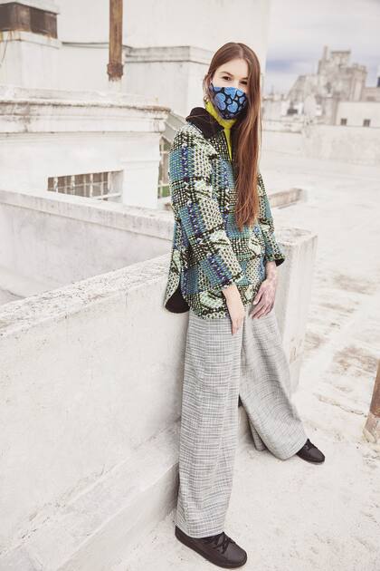 Polera de lana, sacón tejido en lana, pantalón tiro alto, zapatillas Topper para Benito Fernández. Barbijo azul con estampa de corazones con tira posterior y ganchos en dorado. Todo, Benito Fernández