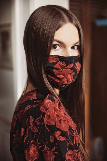 Vestido estampado en seda natural, cuello redondo y mangas largas con detalle de fruncido en los hombros y barbijo de la misma tela. Evangelina Bomparola