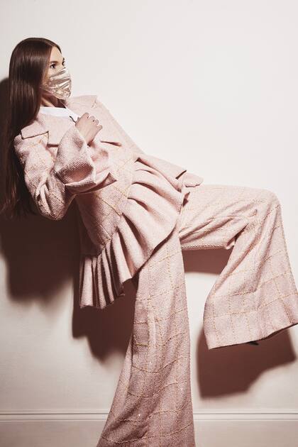 Conjunto tejido en lana con detalles en canutillos dorados, saco con volados en puños y base, pantalón tiro alto y ancho. Barbijo bordado en tonos rosados y dorados. Jorge Rey