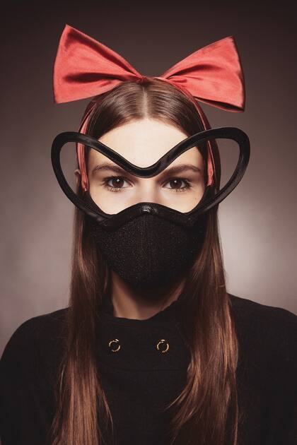 Barbijo de diseño con lentejuelas negras y lazo en seda, con aplique. Florencia Tellado