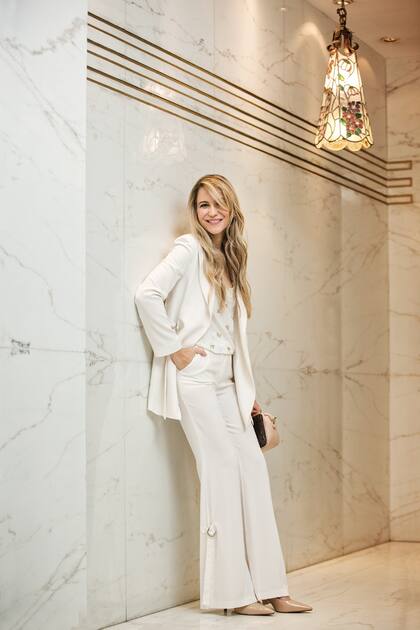 Traje blanco oxford (Naima), top lencero (Paula Cahen d'Anvers), stilettos de charol (Blaquè), cartera print (Lazaro)
