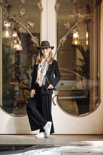 Traje velvet con strass (Vitamina), blusa (Rapsodia), zapatillas (Sofi Martiré), pañuelo estampado (Mishka), sombrero (Uma)