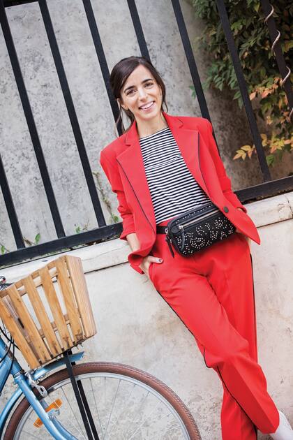 Traje rojo (Paula Cahen d'Anvers), remera de algodón (Giesso), riñonera de pelo con tachas (Prüne)