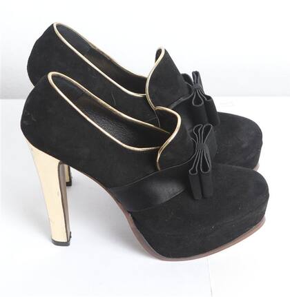 Zapatos de gamuza con moño, ribete y taco en cuero dorado (Paruolo, $ 1499)