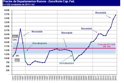 Actualmente, el precio de un departamento nuevo de 50 m2 cuesta en la zona norte (buena) de la Ciudad de Buenos Aires 3600 dólares por metro cuadrado, aun cuando estamos sufriendo una alta recesión de la economía y de las ventas inmobiliarias.