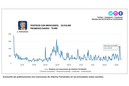 Sentimiento de la conversación. Desde que asumió la Presidencia, Alberto Fernández registra un promedio de 78.900 publicaciones diarias referidas a su figura (alrededor de 1 publicación por segundo), desde las redes sociales Twitter, Instagram y Facebook.