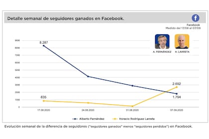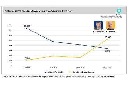 En línea con lo comentado, algunas métricas vinculadas al comportamiento de los usuarios reflejan la caída de Fernández y el crecimiento de Horacio Rodríguez Larreta. Un ejemplo de esto queda evidenciado en la diferencia matemática entre seguidores ganados y seguidores perdidos que tienen estos referentes en las últimas semanas.