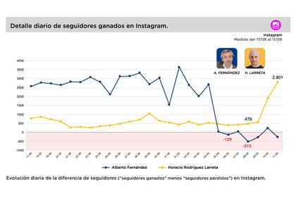 En Instagram -la plataforma con mayor registro de afinidad hacia el Presidente- se observa el mismo comportamiento: miles de usuarios dejaron de seguir a Fernández generando balance negativo en los "seguidores ganados". En Horacio Rodríguez Larreta se puede ver el mismo crecimiento exponencial detectado en el monitoreo realizado sobre Twitter y Facebook.