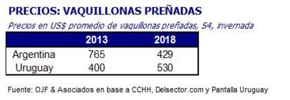 En Uruguay el precio de venta actual es 25/30 % más caro que lo habitual, debido en parte a que el tipo de cambio estaría por debajo del equilibrio de largo plazo. Hace 5 años en Uruguay el precio de una vaquillona de cría era aproximadamente de unos u$s 400, mientras en la Argentina dicho precio rondaba los u$s 765/800 el animal. Es decir, se ha mejorado el precio en dólares de la Argentina, lo que hace más atractivo el desarrollo de la ganadería, aunque cabe aclarar que es difícil establecer un precio promedio en nuestro país pues el mercado está muy volátil.