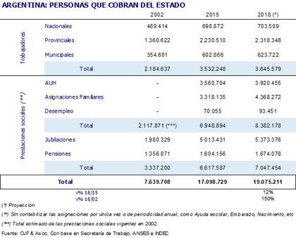 En 2019 tendremos elecciones, por lo cual no es factible que haya modificaciones sustanciales en el esquema de los que cobran del Estado. En 2018, más de 19 millones de personas cobran en alguna medida del Estado: antes de iniciarse el gobierno kirchnerista -que arrancó el 25 de mayo de 2003 y duró prácticamente 13 años-, los que recibían un monto del Estado eran alrededor de 7 millones de personas. En 2002, esa cifra representaba al 20,4% del total de la población; ahora es el 42,9% de la Argentina.