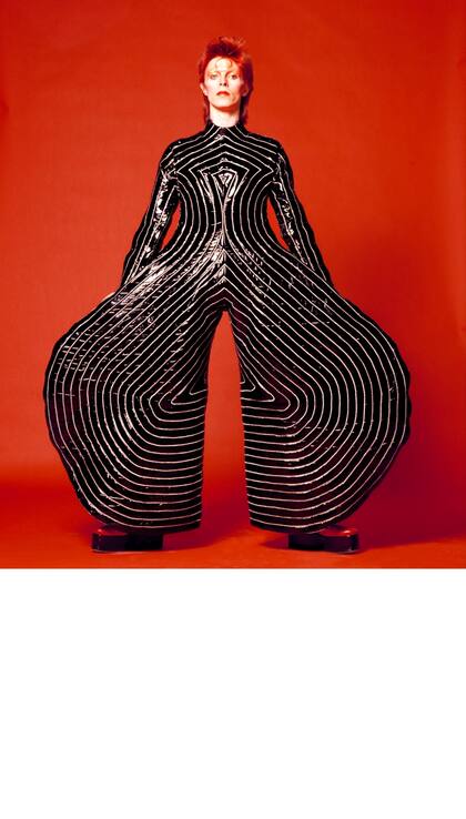 Explotando su figura andrógina, un mix pos-sixtie entre la modelo Twiggy y el tenor pop Scott Walker, David Bowie hizo de su cuerpo un soporte para que los modistos más radicales ensancharan las fronteras del diseño. El estilo unisex no fue en él tanto una tendencia como una vanguardia capaz de vehiculizar imágenes de alto impacto estético como esta fotografía de Masayoshi Sukita con un modelo exclusivo que le hizo Kansai Yamamoto para la gira de 1973. En su rol de mannequin alienígena Bowie merece ser revisado como uno de los nombres claves del arte de performance de los años 70, verdadero puente entre el accionismo vienés y héroes del underground de los 80 como el clown extremo Leigh Bowery. Desde ese lugar inspiró el ojo de la moda (los diseños de Jean Paul Gaultier, Kate Moss posando como él en Vogue) y la visualidad mutante de las estrellas pop (Madonna, Björk, Lady Gaga).