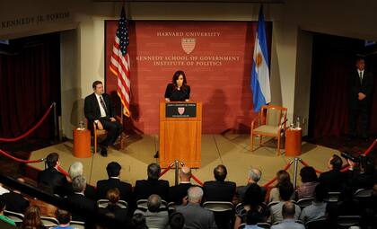 Molesta e irritada, la Presidenta respondió preguntas de los estudiantes de la Universidad de Harvard, frente a quienes negó el cepo cambiario y sus conflictos con la prensa. Foto: DYN