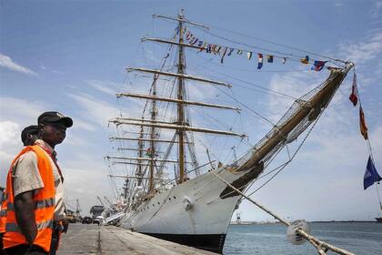 En el puerto de Tema, en Ghana, la Fragata Libertad pasó 77 días, varada por el reclamo judicial de un fondo buitre; el 9 de enero llegará de regreso al país. Foto: EFE