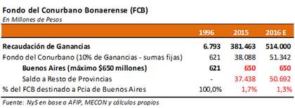 Por este motivo, años atrás se creó el Fondo del Conurbano, por Ley 24.073 de 1992, y se decidió alimentarlo con el 10 % de la recaudación del impuesto a las ganancias. Estos recursos estaban destinados a reparar el déficit mencionado. Sin embargo, en 1996 se aprobó un tope nominal de $ 650 millones para el Fondo del Conurbano Bonaerense destinado al GBA, a través de la Ley 24.621. El excedente de recursos sobre dicho tope debía ser repartido entre las demás provincias, según los coeficientes de distribución secundaria de la Ley de Coparticipación. Con el gobierno que se inició en 2003 comenzó un proceso inflacionario que licuó el límite máximo nominal de $ 650 millones por año recibido por Buenos Aires.