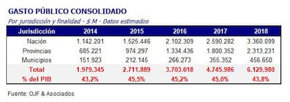 La gestión de Mauricio Macri ha mantenido dicho gasto público total neto prácticamente en esos niveles records pues en 2016 dio 45,2 % del PIB, producto del aumento en diversos gastos de ayuda social, corregido por la disminución de subsidios a los servicios públicos. En 2017, se llegó a un valor del gasto consolidado de 45,0 % del PIB y en 2018 se estaría bajando hasta 43,8 % del producto, como consecuencia de que han tenido que reajustarse varias variables en forma de shock, como por ejemplo el caso del tipo de cambio. Lo normal es que este gasto consolidado se ubique alrededor del 28-30 % del PIB, pero incluso hay años en que ha bajado debajo de 28 % del producto, lo que muestra el esfuerzo que habrá que hacer en el futuro para corregir esta situación.