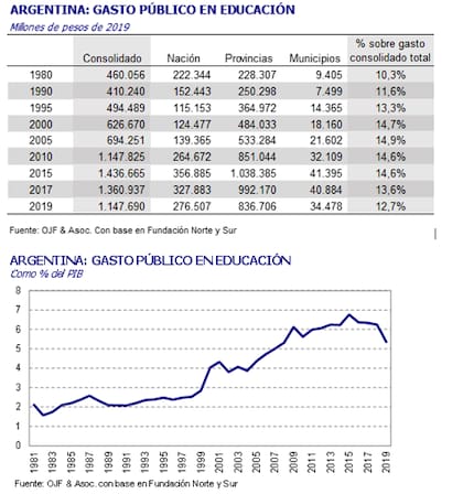 En 2019 se gastaron en el sector educativo consolidado (Nación, provincias y municipios), eliminando las transferencias entre sectores, la suma de $1.147.690 millones, según las cifras de la Fundación Norte y Sur, basado en "Dos siglos de economía argentina" que acaba de publicarse. Este gasto del año 2019 alcanzó al 12,7 % del total de los gastos públicos consolidados, pero fue menor que el logrado algunos años antes, por ejemplo en el 2015, donde había llegado al 14,6 % del total de gastos.