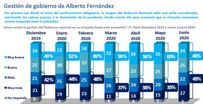 De este modo, la sumatoria de la imagen buena y muy buena del Gobierno alcanzó el mismo nivel que tenía en febrero, momento a partir del cual inició una fase ascendente que concluyó en junio, cuando registró una caída de 11 puntos.