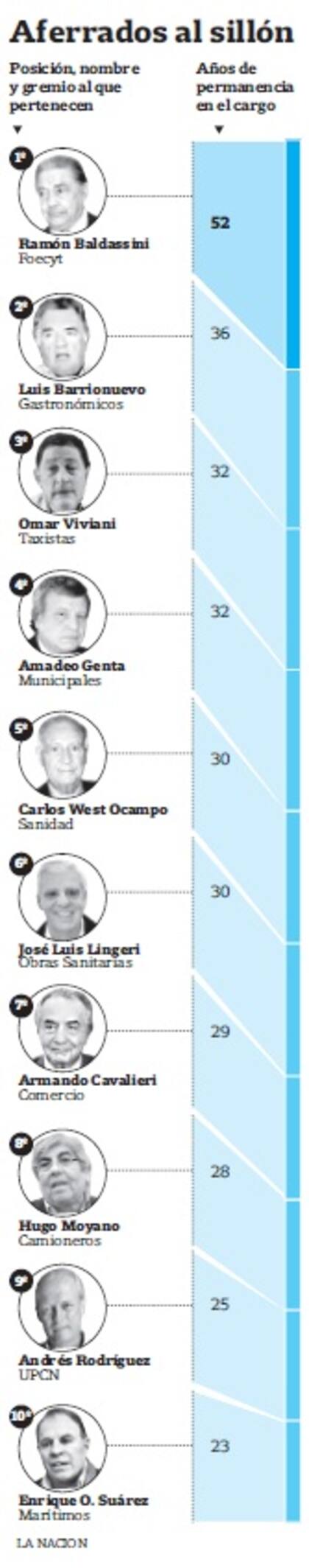 Los ejemplos de jefes sindicales a perpetuidad son muchos más: Luis Barrionuevo conduce el gremio gastronómico desde hace 36 años; Omar Viviani está al frente del gremio de los taxistas desde hace 32, al igual que Amadeo Genta en la entidad que agrupa a los empleados municipales; también Carlos West Ocampo (Sanidad) y José Luis Lingeri (Obras Sanitarias) están al frente de sus gremios desde hace más de 30 años; Armando Cavalieri lleva 29 en la secretaría general de la Federación Argentina de Empleados de Comercio y Servicios (Faecys); Hugo Moyano llegó a la conducción del gremio camionero hace 28 años, en tanto que Andrés Rodríguez gobierna la Unión del Personal Civil de la Nación (UPCN) desde hace un cuarto de siglo.