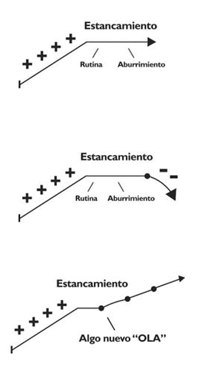 Toda vez que emprendemos un proyecto, comenzamos motivados y entusiasmados. Realizamos actividades nuevas que nos permiten alcanzar un crecimiento hasta lograr una estabilidad. Es allí donde nos mantenemos, pues llegamos a una meseta. Si ésta permanece en el tiempo, surge el aburrimiento y la rutina, lo cual da lugar al decrecimiento.