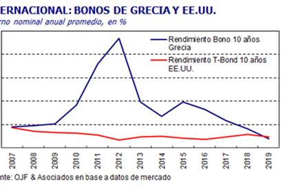 Es la actualidad, 31 de julio de 2019, la tasa de interés del bono griego a 10 años es 2,04 % anual, que es algo menor que la de los bonos americanos a 10 años que a esa fecha era de 2,05 % anual. Después de varios años de ajustes y de mejor y de buena reacción de la balanza de pagos, especialmente en el rubro turismo, que en 2018 llegó a los más altos números de 30,1 millones de personas entrantes (uno de los más grandes centros turísticos para un país de ese tamaño), entre otros factores, podemos decir que la crisis de Grecia ha sido superada, a pesar de todas las dificultades por las que tuvo que atravesar. Esto lo decimos porque su riesgo-país es menor o a lo sumo igual al de Estados Unidos. Después de la reducción de tasas de la FED (el Banco Central americano), en estos días de agosto de 2019, cuando se aplicó una reducción de 0,25 %, la tasa americana de referencia, esta se sitúa en el mercado para el bono de 10 años en 1,80 % anual, pero las diferencias con Grecia son prácticamente mínimas.